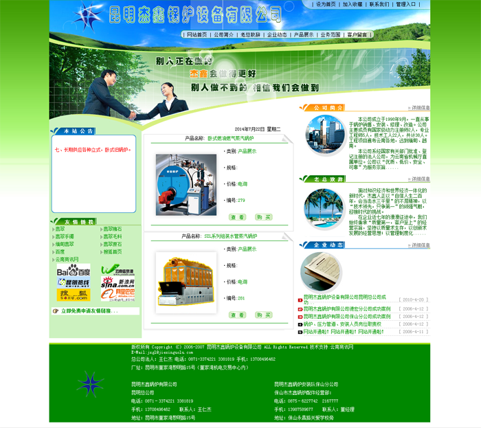 目前,公司主要是美國FULTON燃油(蒸汽、熱水)鍋爐、電(蒸汽、熱水)鍋爐、澳大利亞南方集團熱水器公司電熱水器、成都豪特容積電熱水爐、瑞典阿法拉伐板式換熱器、韓國慶東熱水鍋爐、韓國泰宇(蒸汽、熱水)鍋爐、韓國斯大鍋爐、德國WILO水泵、江蘇風神空調(diào)集團、豪瓦特熱泵、上海喬治·費歇爾系統(tǒng)有限公司及日本、德國、英國等國內(nèi)外一流的鍋爐供暖設備在云南的總代理。業(yè)務涉及到勞斯萊斯發(fā)電機組、變壓器、電氣設備等其它行業(yè)。同時公司下設機電加工廠,專業(yè)生產(chǎn)熱管暖風爐,常壓鍋爐及其它非標設備。