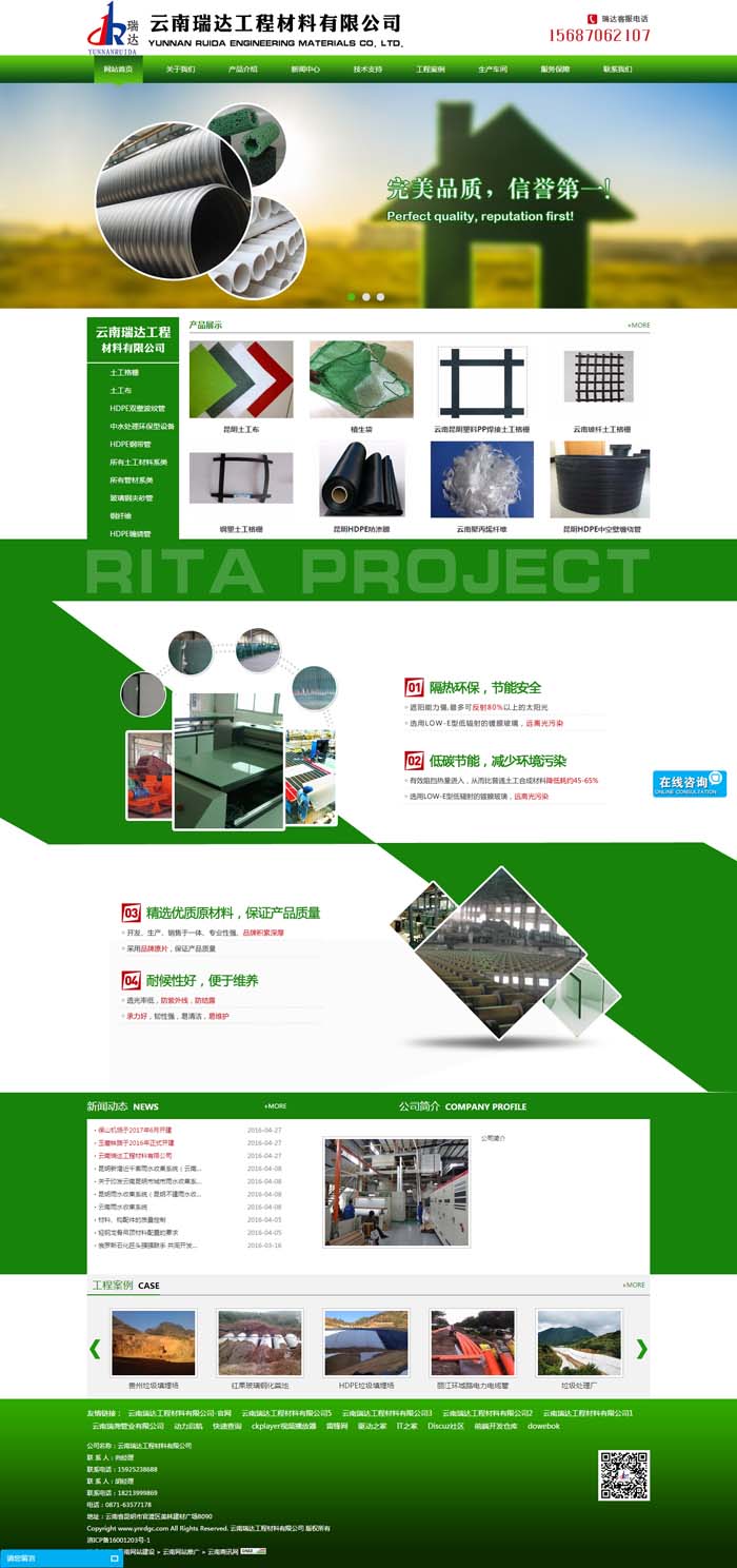 云南瑞達(dá)工程材料有限公司地處云南省昆明市官渡區(qū)美林建材廣場(chǎng)是一家專(zhuān)業(yè)從事土工合成材料、給排水管網(wǎng)生產(chǎn)及銷(xiāo)售和施工為一體的綜合性企業(yè)?,F(xiàn)開(kāi)發(fā)生產(chǎn)有云南HDPE防滲膜|昆明復(fù)合土工膜|云南土工布|昆明土工格柵|土工格室|鋼纖維|聚丙烯纖維|土工網(wǎng)|生態(tài)帶|美植袋||植草格|土工膜焊接機(jī)|GCL膨潤(rùn)土防水毯|云南軟式透水管|昆明鋼纖維|聚丙烯纖維|塑料盲溝|HDPE雙壁波紋管|碳素管|鋼帶管|纏繞管|云南HDPE燃?xì)夤軀昆明鋼絲網(wǎng)骨架管|云南昆明雨水收集系統(tǒng)|云南碳素鋼|昆明cpvc電力管|云南玻璃鋼夾砂管|昆明玻璃鋼化糞池|塑料檢查井|昆明PP焊接土工格柵|HDPE給水管|PE熱縮帶|昆明閘閥配件|鑄鐵井蓋|昆明排水板|云南蓄排水板|云南昆明邊坡防護(hù)網(wǎng)|預(yù)應(yīng)力波紋管|打孔波紋管|丹強(qiáng)絲|混凝土添加劑|PP-R管等系列產(chǎn)品。