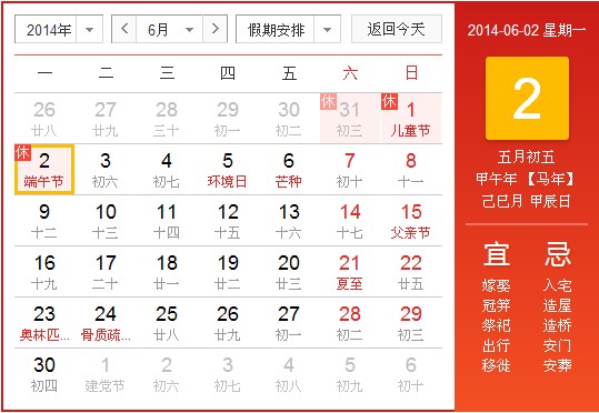 2014年端午節(jié)放假安排:6月2日放假,與周末連休,共3天。其中5月31日(星期六)、6月1日(星期日)公休,6月2日(星期一,農(nóng)歷端午節(jié)當日)為國家法定節(jié)假日、6月3日(星期二)照常上班。