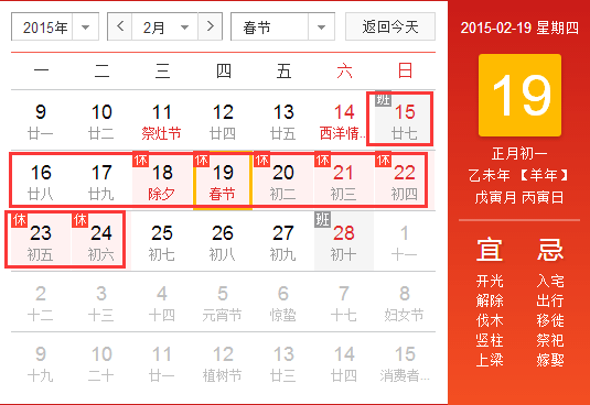 2015年春節(jié)放假安排:2月15日至2月24日放假調(diào)休,共10天。2月14日(周六)、3月1日(周日)上班(補(bǔ)班)。