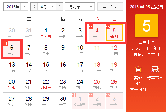 2015年4月4日至6日放假共3天。其中4月5日(星期天,農(nóng)歷清明當(dāng)日)為法定節(jié)假日,又剛好星期天公休,所以調(diào)到4月6日(星期一)補休。