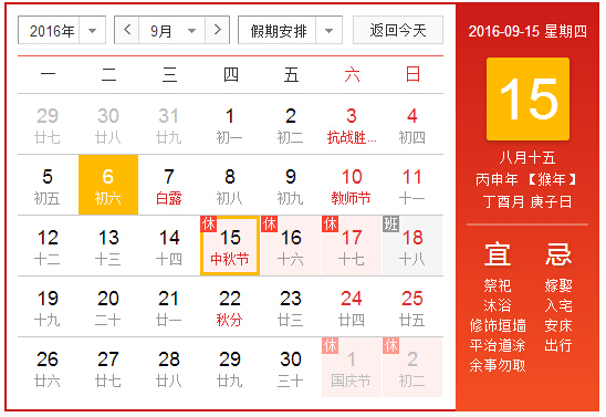 2016年的中秋節(jié)正逢新歷915號(hào)周那天,由此2016年中秋節(jié)放假時(shí)間為:9月15(星期)中秋節(jié)、9月16、9月17日,共9月18日(星期)上班。