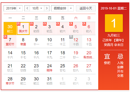 根據(jù)最新放假安排,2019年我國(guó)國(guó)慶節(jié)從10月1日開(kāi)始至7日放假調(diào)休,共7天。