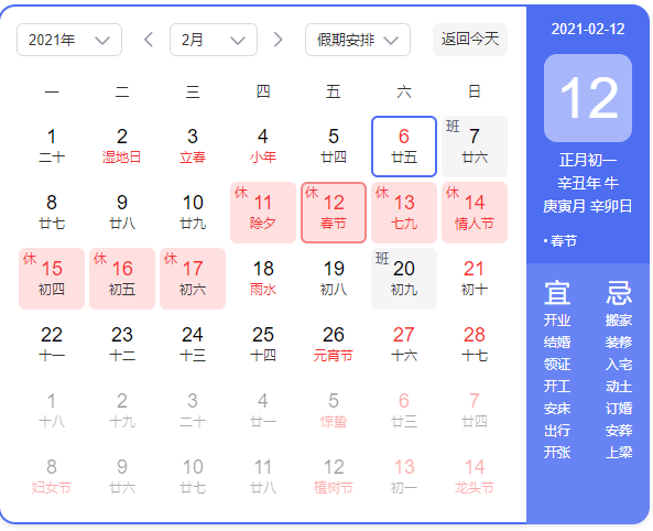 2021年春節(jié)放假時(shí)間為2021年2月7日(農(nóng)歷十二月二十六)至2021年2月17日(正月初七)放假11日。2021年2月18日(正月初七)正常上班。